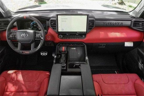 全新22款丰田坦途TRD越野版采用悬浮式中控大屏设计,中控屏从低配版8英寸到顶配版的14英寸,并且还提供有12.3英寸的全液晶仪表盘可供选择,支持CarPlay和 Android Auto系统。值得一提的是,新车全系标配Toyota Safety Sense 2.5智行安全系统,具备拖挂模式、蠕行模式、越野模式等多种驾驶模式。