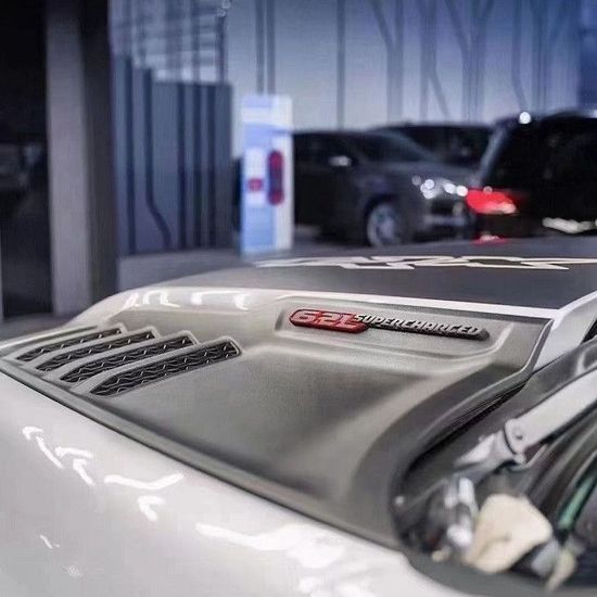 22款道奇公羊霸王龙传承了家族高大威猛的造型设计,同时细节部分融入了更多高性能元素,包括经过黑化处理的前格栅,引擎盖两侧的黑色进气口,以及为了容纳巨大的机械增压器而设计的通风口等等。此外,新车还配备了视觉冲击力更强的黑色轮眉和外露式的拖车钩,看上去十分霸气。