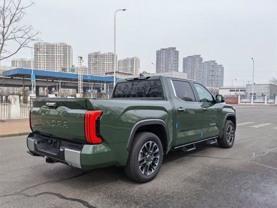 丰田坦途有棱有角的车头前脸,大尺寸蜂窝状进气中网搭配镀铬边框处理,两侧泪痕造型LED矩阵大灯视觉效果并不输给福特猛禽 (配置|询价)。丰田坦途车身侧面看也有了方盒子外观效果,甚至还要熏黑车窗立柱营造出悬浮车顶。