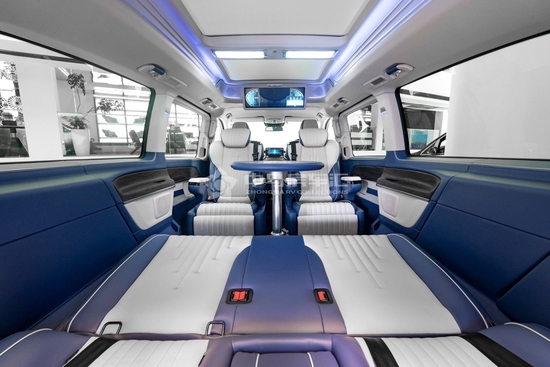 后舱三排联动式沙发座椅,可一键式躺平。