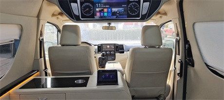 丰田海狮驾驶舱升级9寸导航,搭配360度全车影像,红木方向盘,升级了原厂桃木纹内饰改为进口红木,豪华感顿显。主副驾驶座椅真皮包覆,主副驾驶座椅四向电动调节带通风加热,主副驾驶中间升级车载扶手冰箱。丰田(进口)海狮-HIACE主副驾驶后面,加装了24寸高清液晶电视娱乐系统,全车升级阿尔派音响系统。