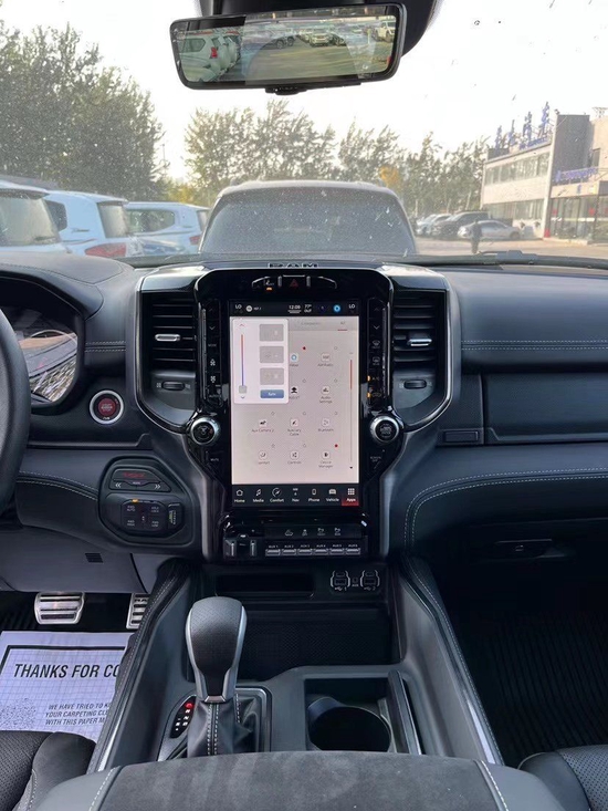 22款道奇霸王龙6.2L在内饰部分进一步强化了其高性能版本的形象,中控台和座椅随处可见的TRX标识便是最好的例证。同时,作为道奇家族的旗舰车型,新车还配备了12英寸竖置中控屏幕,除了支持蓝牙、导航和车载Wi-Fi等常见功能,还支持Apple CarPlay和Android Auto手机映射。