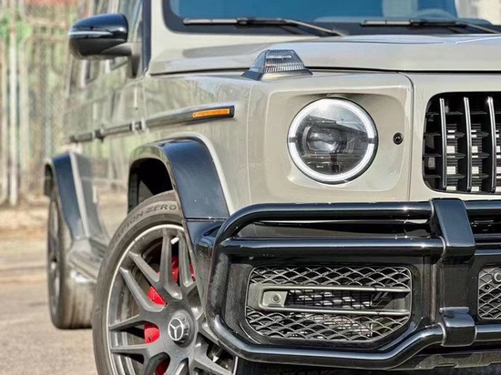 23款奔驰G63此车配置:阿拉伯灰漆面,AMG 碳纤维饰板,红色刹车卡钳,AMG 高性能碳纤维方向盘,真皮扶手,22 英寸熏黑轮毂,暗夜包(黑色后视镜+熏黑备胎罩、黑曜石保险杠、黑色碳刷防护罩、AMG 青铜格栅、有色前指示灯、 有色前照灯+尾灯),独家内饰包(独家 Napp、皮革菱形座椅和 Nappa 皮革内部装饰件、主动式多轮廓前排按摩椅、 前排座椅快速加热功能 前排通风座椅),GT按键。