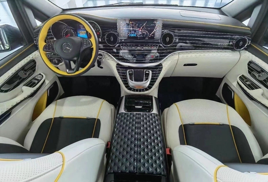 奔驰V级 (配置|询价)商务车V260L改装四座豪华商务车,在设计的档次感方面比之前唯雅诺有了非常大的进步,外观也许给人感觉变化并不是特别大,那么内饰则完全不一样了,最近的奔驰家族风格我们已经很熟悉了,而用在一款MPV上还是让车内一下子变得高大上了很多。而且像一些细节之处的设计也向着轿车看起,比如仪表盘、方向盘和多媒体系统等,这也让它逐渐脱离之前很像是一款商用车的印象。