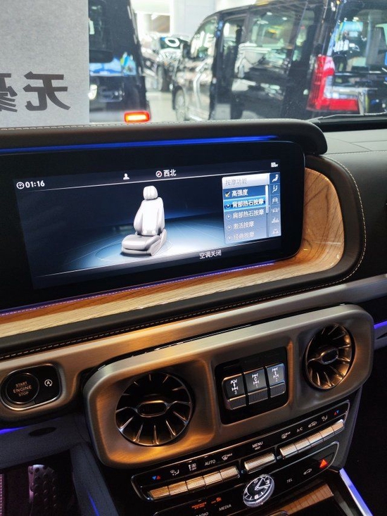 22款奔驰G550级原先无论经历如何包装,选用各种高级材料重塑车厢,但从刻板的内饰面貌上只能传递出工具车的印记。如今进入全新的车厢后,能够看到最新奔驰家族化内饰设计,眼前的景象完全看齐自家SUV旗舰。车厢内除了经典的实木饰板外,还应用了金属、碳纤维和皮革等高级材质。