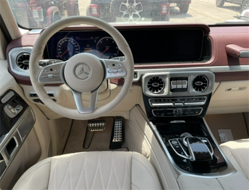 奔驰G400D在内饰方面豪华气息浓厚,仪表盘采用双炮筒式设计,再配合中间的液晶显示屏,粗犷之中又不失精致,宽广的空间, 让人瞬间有一种自由奔放的感觉, 大量的真皮设计以及一些恰到好处的点缀材质,尽显高贵奢华。 奔驰G400D柴油版宽敞开阔的车内空间就已经令人倍感自由奔放,特有的居高临下的座椅位置确保您时刻保持极佳的全方位视野。拥有奢华的内饰装饰,大量的真皮运用以及可通过选装的点缀材质,搭配上富含科技感的中控仪表设计,充满着一种藐视一切的自信感。