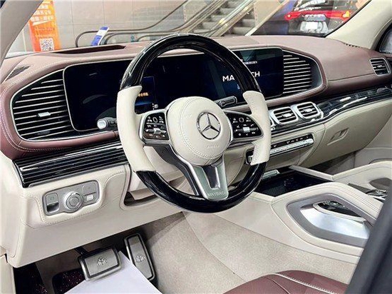 奔驰GLS450改装升级迈巴赫GLS600内饰整体皮饰改成了浅灰色的设计,替换了钢琴黑条纹桃木饰板,桃木方向盘,加装了HUD抬头显示系统,主机系统也刷了迈巴赫的开机画面,车内随处可见的迈巴赫标志,打造无出其右的考究质感。