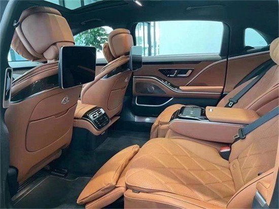 内饰方面,和奔驰S级 (配置|询价),前排方面,差别不大,12.3英寸全液晶仪表盘,12.8英寸OLED曲面中控屏,15个扬声器的柏林之声音响,64色环境氛围灯,NAPPA皮质包裹的座椅,前后排手机无线充电功能,后排由于比S级长得多,又只有两个座位,中央由多媒体屏隔开,所以空间非常宽敞,独立座椅需要选配,后排还带两块独立的液晶屏