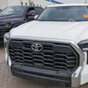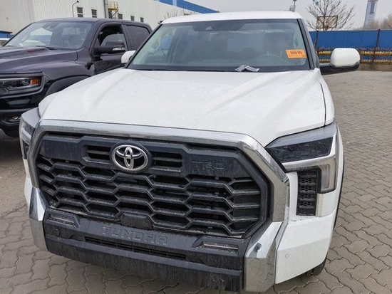 丰田坦途直接提供了有棱有角的车头前脸,大尺寸蜂窝状进气中网搭配镀铬边框处理,两侧泪痕造型LED矩阵大灯视觉效果并不输给福特猛禽 (配置|询价)。车身侧面看也有了方盒子外观效果,甚至还要熏黑车窗立柱营造出悬浮车顶。