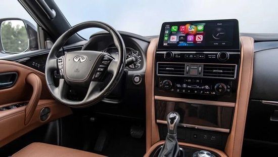 另外,通过观察可以看到位于触摸屏的下方,控制区方面也有所变化。新款QX80减少了更多的按键,把其他不常用的功能都移动到触摸屏上,在控制区只留下常用的几个按键和旋钮,比如音响系统和空调控制系统。在空调控制模块往下,则用一块木头饰板格挡开来,里面有一个点烟器以及一个无线充电模块,还有一个最大12V的供电插口。驾控方面也增加了一些小细节,比如QX80在原有的车道偏离预警系统中,加入了方向盘震动警告功能,极大地提升了行车安全性。