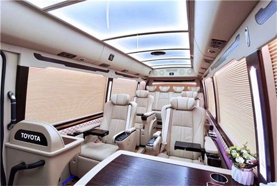 丰田考斯特特车型空间较适合,此一般商务车大,比大巴车又小。装上十人座正好适合领导、助手、翻译、保镖、记者随行,有利于沟通和提高工作效率。