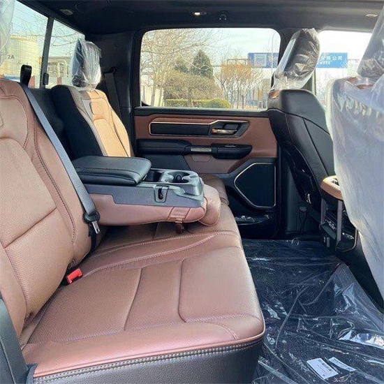 道奇公羊长角号皮卡在内部设计上还是延续了美式那种比较粗犷的风格,规整的做工用料看上去就非常有质感,丰富的配置会让你不由得为其称赞,中控台的设计简洁硬派,符合公羊的气质,仪表盘底边有花纹,则更加凸显了这款车的文雅性,软性材质的仪表台设计,摸上去手感非常舒服,并无些许生硬之处