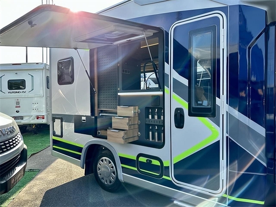 外观上整体车身拉花色彩跳跃,小额头造型低矮扁平,考虑到了充分的空气动力学效果,在额头两侧配有条状灯带,可以当作转向灯、双闪指示灯使用。在厢体部位,左侧配有市电接口、注水口。该车提供160L净水箱、85L灰水箱;电路是整台车的亮点所在,5000W逆变输出+48伏12.5度电+高转换率600W太阳能甚至可以给自家的电车充电。