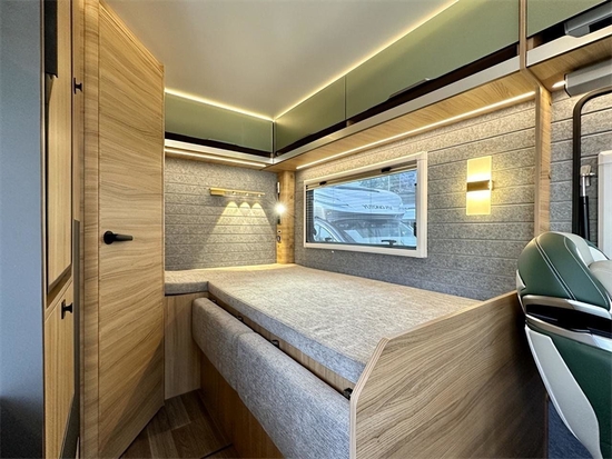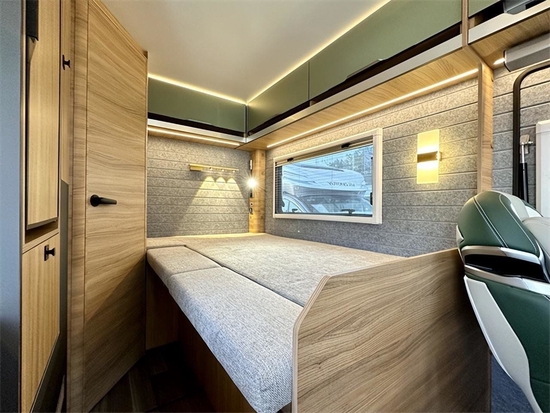 休息区采用纵置床设计,床铺尺寸为2000×1200mm,可以容纳双人休憩。床里侧采用软包处理,灰色绒布墙面设计会显得休息区更有质感。床铺侧面配有车窗、床头阅读灯、充电口等,方便车主娱乐或阅读使用。顶部配有储物吊柜,可以收纳日用物品