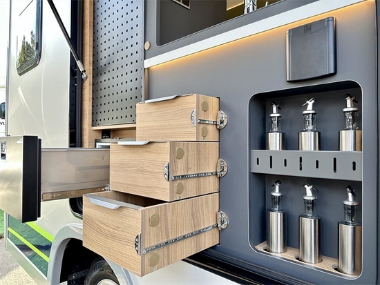 厨房操作台内嵌有不锈钢洗菜池,侧边设计有延伸桌板增加操作空间,顶部和下方还有充足的储物空间收纳旅途中的碗筷厨具等,侧边还有调料架收纳调味料,旅途中烹饪拿取更顺手。操作台右手边柜体上方内嵌有一台90L赛特福德直流冰箱,储存一些食材,随时随地享受新鲜美味,下方的衣柜可以用于收纳旅途中的衣物或是薄被褥,车内更加整洁有条理。