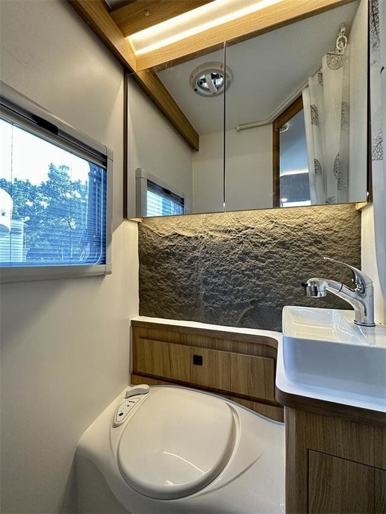 卫生间采用一体式设计,笔者注意到内部有个比较有特色的设计,卫浴间梳妆镜一侧的墙面采用峡谷风的装饰,别具一格。内部配备有陶瓷洗手盆、塞特福德抽拉马桶、3kg滚筒洗衣机、储物柜、梳妆镜等设施。20L电热水器能让车友即使在冬日也能舒心洗个热水澡。