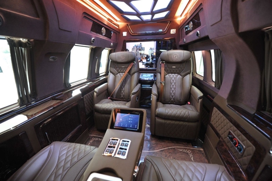 GMC商务车内饰布局方面:湾流头等舱航空椅、窗台电动折叠办公桌、开启功能强大的中控台,集成式Wi-Fi热点,气压式活力按摩功能豪华头等舱座椅,电动升降大屏幕超薄液晶电视、专属Harman5.1声道环绕音响。10”多功能触摸屏控制系统、储物槽。车载视频会议系统、 车载电热水壶、车载保险箱、电动酒柜、车载密码箱、车载制冰型冰箱及多功能插座均为隐置式。整车功能随心操作,变换空间组合,承载更多可能。