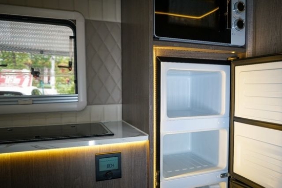 厨房区有冷热水双控洗菜池、电磁炉,抽油烟机、49升冰箱、微波炉、橱柜等设施。即使是在路途中饿了,也能凭借这些设施,做一手可口的饭菜。中门设有双向抽屉和拓展外置厨房小桌板,实用性极高。刘经理:17694965222《同微信》