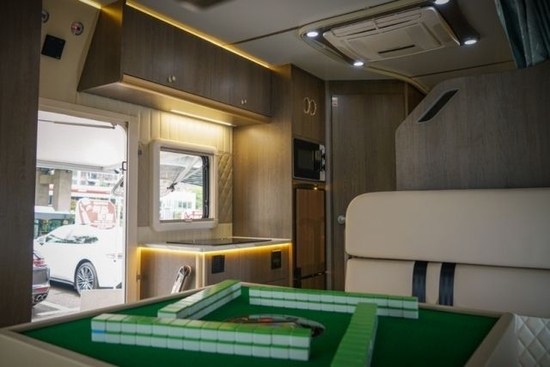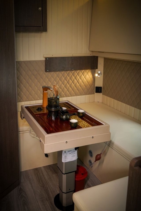 座椅左上方是双向外推窗和顶部吊柜,日常小物件都可以放置在这里。即开即关即落锁,不用担心物品的散落,餐桌带拓展功能,还可拆卸,多功能座椅可秒变一张单人床,整车控制面板也在座椅左手边,设计更贴心。