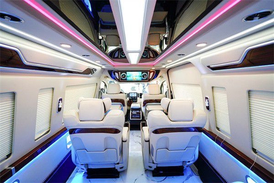 这台海狮整车升级了加强型的隔音隔热处理,车内带空气净化系统,无线充电系统。在进门侧加装了氧化铝脚踏带迎宾灯的,整车都是采用纳帕级皮质进行包覆的,侧壁红木装饰,手动百褶窗帘,后舱暖风系统,最后说说棚顶灯光,这个有智能触摸控制系统。灯光超级棒。