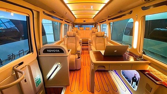丰田考斯特在改装方面更加注重商务旅行中办公的实用性。车内的真皮航空座椅,电动调节装置可以让您自行调节最舒适的空间距离、靠背以及脚托的角度,特殊的座椅构造,华通丰业增加腰部的支撑,宽敞的空间让您的双腿收放自如,忘却旅途的紧迫感,体验如家般的感觉,缓解您在行车旅途中的疲劳。 内饰增加豪华高档办公桌以桃木及真皮为材料,打造最舒适高端使用的办公环境。