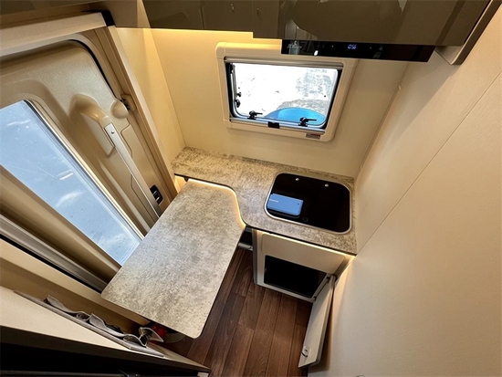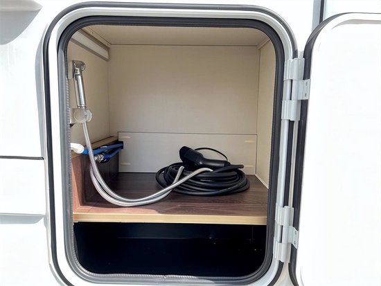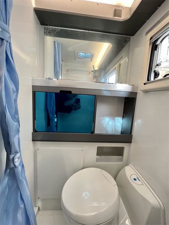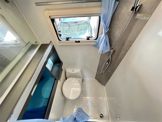 L型的厨房操作区,空间性非常好。配置方面也比较齐全,主要有翻盖式水槽、电磁炉、抽拉柜以及置物柜和储物仓等配置。如果你喜欢自己做饭烹饪,那么这种厨房设计绝对更加适合你。在有限的空间内,还能够拥有独立的卫生间区域,确实有点不容易。该车的卫生间,空间性不是很大,但满足一个成年人的洗漱是没有问题的。配置方面主要有房车专用马桶、淋浴花洒、梳妆镜、毛巾架、储物格以及换气扇等常规性房车配置。