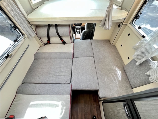 会客区还是多重睡眠功能区,自由炮C配备了两张超大床铺。第一张就是位于驾驶室上方的超大额头床,尺寸达到了1.9m*1.7m,睡下一家三口很轻松,三面环窗,通透性也很不错;第二张床就是对卡座+条形沙发拼成的沙发床,尺寸达到了1.9m*1.4m。大空间的实用感受,也是完全符合其产品定位,更亲近家庭的旗舰布局,6人旅居皮卡房车。