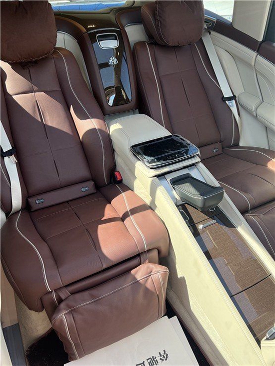 22款奔驰GLS450改装升级迈巴赫后排座椅改成了两座座椅,安装带板控制、无线充电器、小桌板的贯穿长条马鞍,构建长途旅行中恬静的车内氛围及充分放松的乘坐体验。