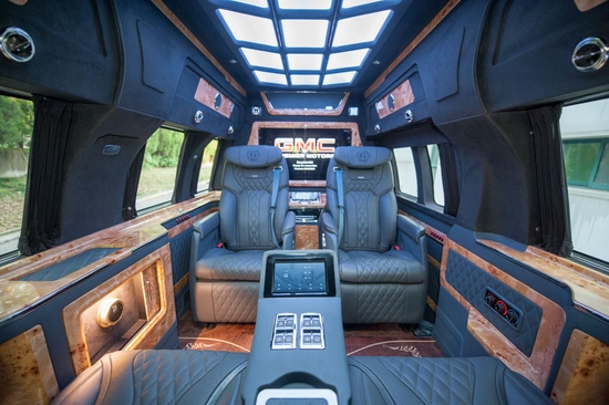 GMC商务之星整车内饰采用半隔断设计,带有一体式观景隔热私密玻璃。第二排湾流经典型豪华航空椅电动通风/加热/气压按摩/旋转/前后/腿托/靠背,第二排座椅后背带有折叠办公桌及个人多媒体影音系统,第三排左右独立电动沙发椅带电动通风/加热/气压按摩。