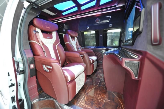 GMC商务之星多功用瀑布型中控台中间是10”多功用触摸屏控制系统可以控制整车的灯光、窗帘、升降电动升降32”LED电视机,带有躲藏式倒车/车侧彩色影像监控系统。顶部是可变色天逸车内顶和电动天窗,整车带有多出躲藏式配置,既不占空间又简介人性化,隐置式电动酒柜、隐置式电热水壶、车载密码箱、车载制冰型冰箱。