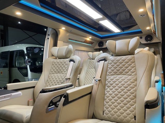 丰田(进口)海狮-HIACE驾驶舱升级9寸导航,搭配360度全车影像,桃木方向盘,升级了原厂桃木纹内饰改为进口豪华感顿显。(华通丰业)主副驾驶座椅真皮包覆,主副驾驶座椅四向电动调节带通风加热,(华通丰业)主副驾驶中间升级车载扶手冰箱。丰田(进口)海狮-HIACE主副驾驶后面,加装了24寸高清液晶电视娱乐系统,全车升级阿尔派音响系统。