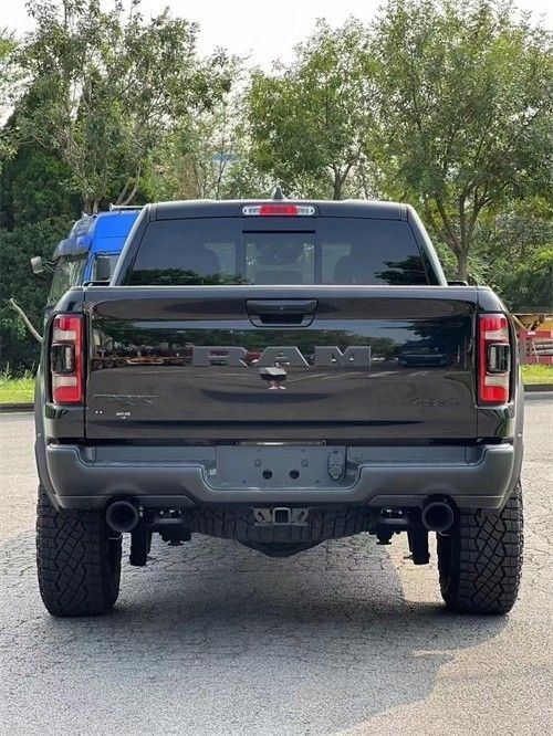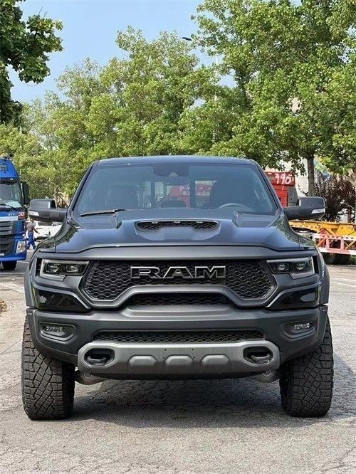 22款道奇公羊霸王龙TRX国六最新款新车传承了道奇Ram家族高大威猛的造型设计,同时细节部分融入了更多高性能元素,包括经过黑化处理的前格栅,引擎盖两侧的黑色进气口,霸王龙 以及为了容纳巨大的机械增压器而设计的通风口等等。此外,新车还配备了视觉冲击力更强的黑色轮眉和外露式的拖车钩,看上去十分霸气。
