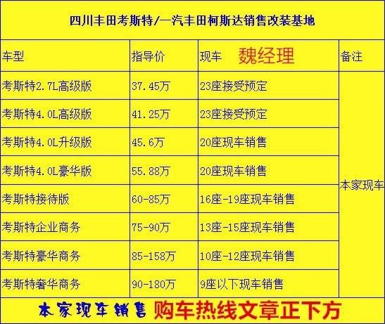 丰田考斯特4S店-厂商指导价:9 座-10 座-11 座-12 座-13 座-15 座-16 座-17 座-19 座-20 座-23 座等豪华内饰改装。房车_商务车_旅居车_中巴车_改装车_客车_华通丰业丰田考斯特 高级 11 座,柯斯达 (配置|询价) 12 座(豪华、旗舰、VIP)13 座(VIP、超级 VIP、超旗舰)16 座(超级 VIP、超级 VIP 商务)17 座(VIP、超级 VIP 商务)颜色米色金属漆,合格证与座椅一致!13811284111 魏经理 同微信