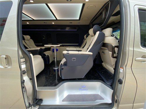 2023款丰田海狮整车升级了加强型的隔音隔热处理,车内带空气净化系统,无线充电系统。在进门侧加装了氧化铝脚踏带迎宾灯的,整车都是采用纳帕级皮质进行包覆的,侧壁桃木装饰,手动百褶窗帘,后舱暖风系统,最后说说棚顶灯光,这个有智能触摸控制系统。灯光超级棒。