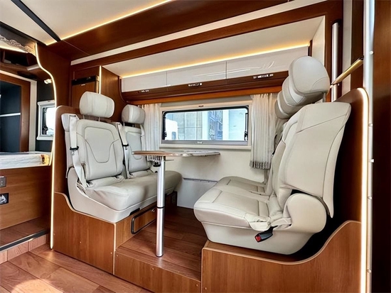 会客区为4人座奔驰原装豪华沙发座椅+升降餐桌的组合,整体均位于拓展结构上,驻车时可扩展车内空间。在车内的娱乐设施上,配备有极米投影仪(投影幕布在驾驶区与后车之间顶部)、进口JBL音响,达到家庭影院的效果