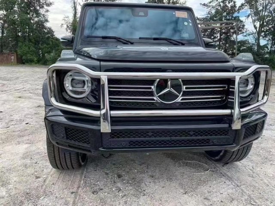 23款奔驰G (配置|询价)550是一部纯粹的全地形越野车,粗犷的外观,标志性的三肋镀铬格栅,大大的奔驰车标非常醒目,硬朗笔直的车身线条完全是硬派越野的风格,车头圆形前大灯设计很复古,平直的线条贯穿全身。