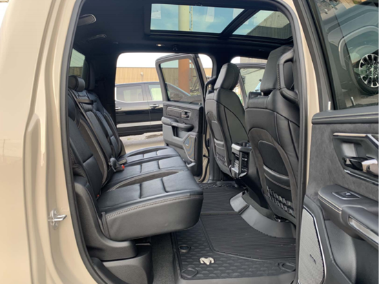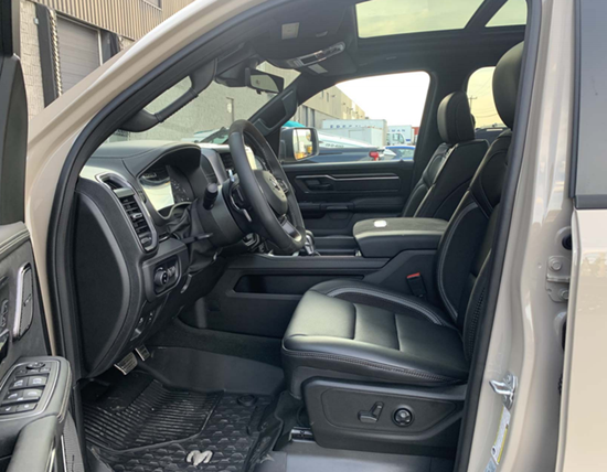 22款道奇公羊霸王龙做工则完全摆脱了美式的粗糙感,边缘、接缝都处理的很精细,真皮座椅各自独立,配有加热、按摩等舒适功能,每个座椅独立配一个操控手柄,各项功能由乘坐者自己控制。