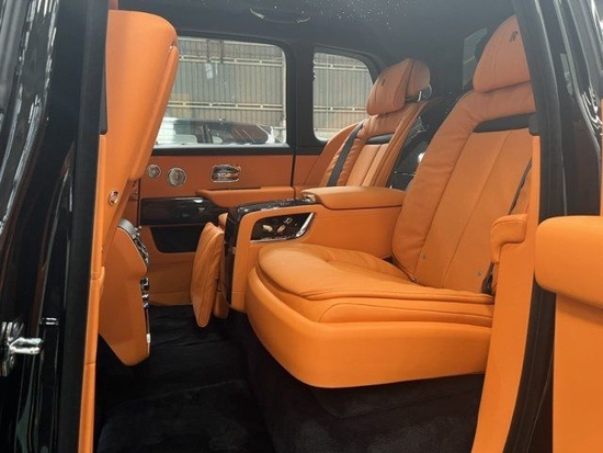 22款欧规库里南Black Badge 黑/橙 四座、流星顶、腰线、后排娱乐、定制内饰、定制音响、驾驶员辅助系统、野餐桌、外部不锈钢包装、前后通风加热座椅、后排按摩座椅、羔羊毛脚垫、RR头枕刺绣、 VIN牌、仪表台顶针式缝线 。