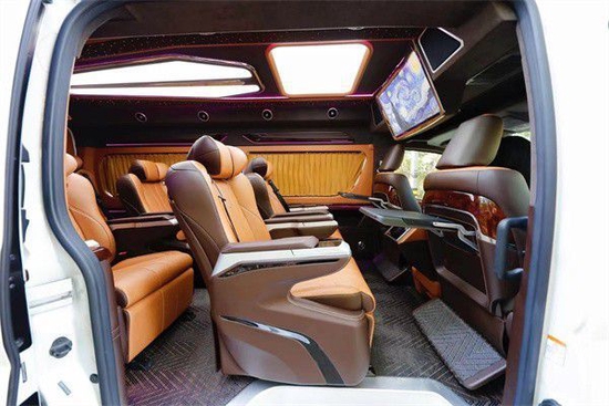 丰田海狮的驾驶舱升级9寸导航,搭配360度全车影像,红木方向盘,升级了原厂桃木纹内饰改为进口红木,豪华感顿显。主副驾驶座椅真皮包覆,主副驾驶座椅四向电动调节带通风加热,主副驾驶中间升级车载扶手冰箱。丰田海狮主副驾驶后面,加装了24寸高清液晶电视娱乐系统,全车升级阿尔派音响系统。
