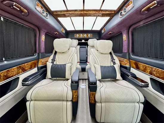 第三排是一个三连排的沙发床,可以180度的进行平躺,如果将旋转过后的座椅腿托升起,即可立马组成两米长的大床。全车配备了窗帘,既可以保证车内日常的隐私性,也可以阻挡阳光的直接照射,不管白天还是晚上,都可以休息的非常好。