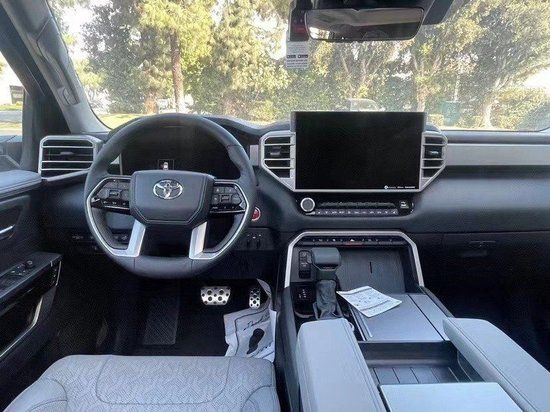 全新一代23款丰田红杉四幅式的多功能方向盘前端为全液晶仪表盘, 大尺寸的悬浮式中控大屏,查看十分便捷。空调出风口造型显得别具张力。副驾驶前端的饰板加入了丰田英文字样。