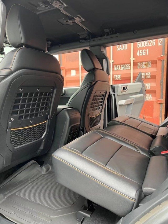 2022款全新福特烈马Bronco新车的内饰整体线条硬朗,造型方正,与F-150 (配置|询价)相似的内饰风格让其硬汉形象更加突出。副驾驶一侧还设计了新车车门的铭牌。在细节上,新车中央采用了一块较大尺寸的中央多媒体屏幕,多媒体屏幕上方采用了与奔驰G级 (配置|询价)相似的三把锁按键以及危险警报灯按键。两侧空调出风口采用方正的矩形设计,整体给人一种粗犷的风格。为了方便清洁,部分Bronco车型带有集成了排水孔的可冲洗橡胶地板,并采用防霉变的乙烯座椅面料。而且主控按钮均带有硅胶保护,防止泥沙和水侵入。