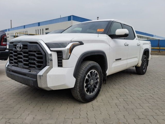 丰田坦途直接提供了有棱有角的车头前脸,大尺寸蜂窝状进气中网搭配镀铬边框处理,两侧泪痕造型LED矩阵大灯视觉效果并不输给福特猛禽 (配置|询价)。车身侧面看也有了方盒子外观效果,甚至还要熏黑车窗立柱营造出悬浮车顶。