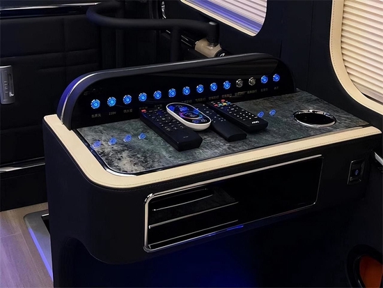 丰田考斯特改装商务车内饰的改装上有许多独特的设计与方案,驾驶席赫尔副驾驶席的座位改装采取加宽加大加厚的设计,同时也可以增加桃木扶手。改装桃木装饰方向盘,既能够保证考斯特的档次及车内设计的美观,同样也可以为驾驶员提供更加舒适的操作。