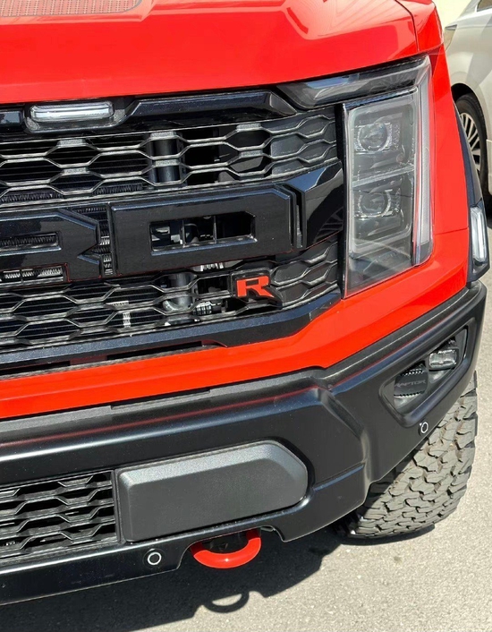 2023款新款福特F-150猛禽R外观方面,新车还是与现款的福特F-150猛禽保持着高度一致,只是在细节上有区别。比如在发动机引擎盖上的隆起效果更高,并且还在旁边加入了专属的标识“RAPTOR”,同时前大中网格栅的下方还加入了红“R”标识,以此来彰显其身份。