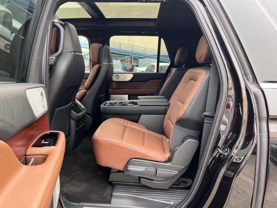 23款林肯领航员3.5T的内饰非常奢华,多功能方向盘,中控台的造型与宽大的车身相呼应,新车全部真皮包裹座椅,内饰采用桃木搭配设计,高贵典雅,加高加大的车身除了增加内部空间外,还给人营造一种尊贵典雅的感觉。最新林肯领航员新车采用了2+2+3的座椅布局,第二排采用了两个独立座椅,座椅内侧均配有扶手,舒适度超强。