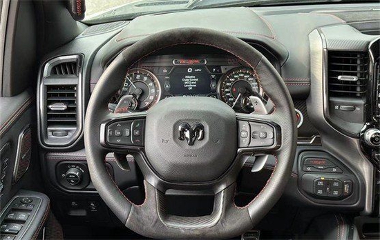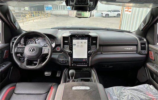 全新22款道奇霸王龙中控台和座椅随处可见的TRX标识便是最好的例证。同时,作为道奇家族的旗舰车型,新车还配备了12英寸竖置中控屏幕,除了支持蓝牙、导航和车载Wi-Fi等常见功能,还支持Apple CarPlay和Android Auto手机映射。