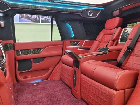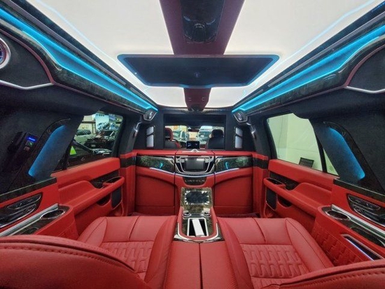 全新林肯领袖一号后排的老板的航空座椅支持3档按摩,座椅的通风,加热,多段式的腿托,柏林之声的音响让你在出行还是商务的时候,都可以舒缓压力放松心情带来天籁般的感受,氛围灯可以多种颜色的切换,全看老板心情,后面前后双电视可以看任何大片,电动窗帘,电动的桌板还有咖啡机都是标配