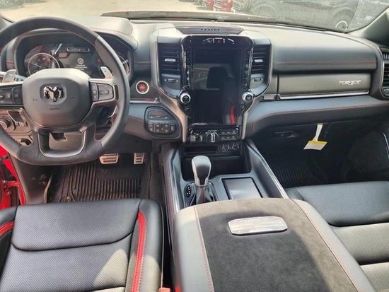 道奇霸王龙TRX在内饰部分进一步强化了其高性能版本的形象,中控台和座椅随处可见的TRX标识便是最好的例证。同时,作为道奇家族的旗舰车型,新车还配备了12英寸竖置中控屏幕,除了支持蓝牙、导航和车载Wi-Fi等常见功能,还支持Apple CarPlay和Android Auto手机映射