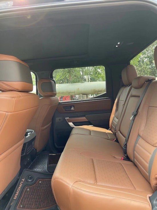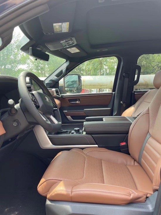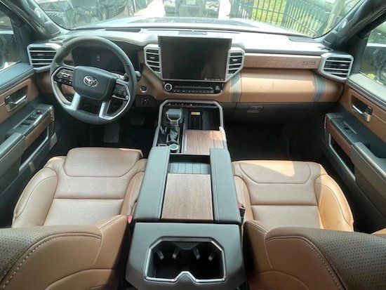 全新22款丰田坦途的内饰设计也采用了新设计风格,“硬”还是第一感受。无论是平直的线条还是灰白的用料配色,车内的风格都是非常偏向于越野,宽大的悬浮式液晶中控屏幕也是挺抢眼的,根据不同配置也将提供有8英寸以及14英寸的不同配置,就是这个感觉还是很像“大彩电”,只是放在这台车上会显得更协调一些,功能上也丰富了在线车联网以及CarPlay车机互联功能。